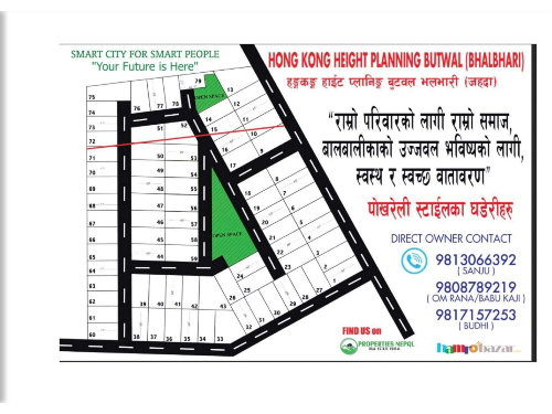 A Residential/Commercial Land for Sale at Bhalbari Butwal Rupandehi ,Nepal for reasonable price ! The Ghaderi size available from 8.5 Dhur to 13 Dhur.This land can be best choice for building house for residential, renting purpose. The surrounding of this land has peaceful ambiance with good neighbors, proper access to water, road and other basic facilities such as electricity,telephone,cable etc.The price of this land is Rs. 4,75,000 per Dhur Negotiable.The land is connected with wide road. Also the place has easy access to public transportation, school, hospital. Near by Land marks are TILLOTTOMA HOMES BUTWAL (400M only) and Purposed Five Star Hotel (200M Only).