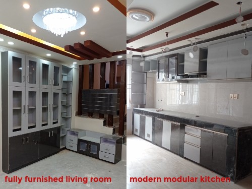 fully furnished living room and modular kitchen